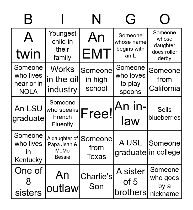 This bingo card has a free space and 29 words: One of 8 sisters, Loves to play Dirty Rummy, Someone who speaks French Fluently, One of 7 kids, A twin, An EMT, Works in the oil industry, A daughter of Papa Jean & MoMo Bessie, An in-law, An outlaw, Sells blueberries, Someone who goes by a nickname, Charlie's Son, A sister of 5 brothers, Someone from California, A Belcher, Someone from Texas, Someone who lives in Kentucky, Someone whose daughter does roller derby, An LSU graduate, A USL graduate, Someone studying to be a vet, Someone who loves to play spoons, Someone who lives near or in NOLA, Someone whose name begins with an L, Youngest child in their family, Someone in college, Someone in high school and Someone from Washington D.