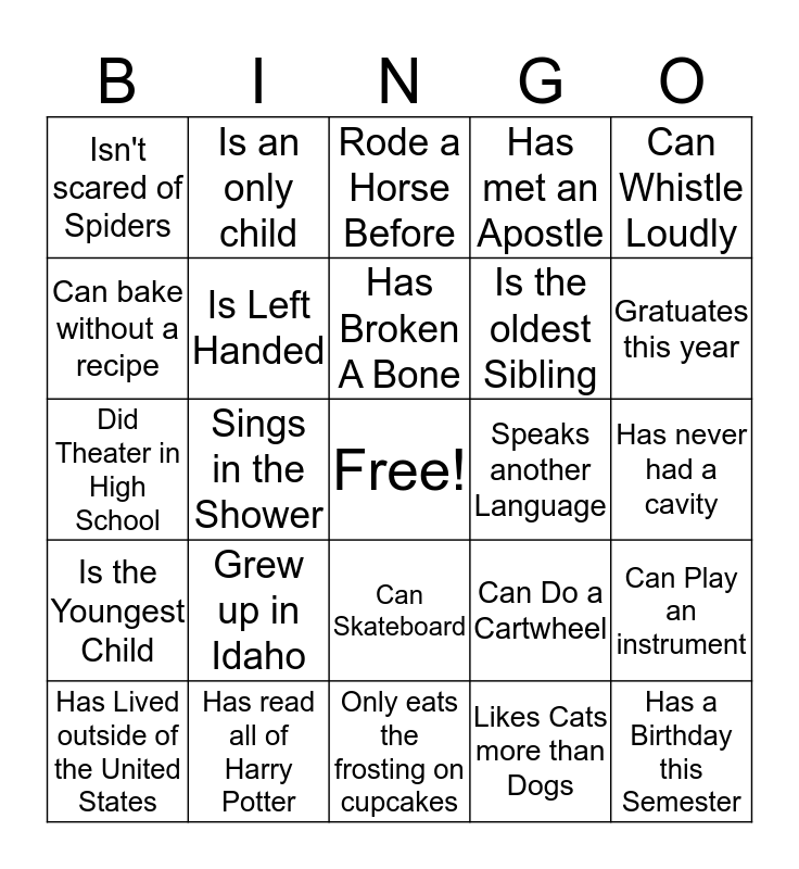 This bingo card has a free space and 32 words: Likes Cats more than Dogs, Loves to Watch Sports, Sings in the Shower, Likes Coke More than Pepsi, Is the Youngest Child, Is Left Handed, Can Whistle Loudly, Can Play an instrument, Is an only child, Has never played a video game, Has Broken A Bone, Rode a Horse Before, Grew Up by a Beach, Has a Sibling who attended BYUI, Speaks another Language, Likes to Eat Broccoli, Has Lived outside of the United States, Did Theater in High School, Can Skateboard, Grew up in Idaho, Can Do a Cartwheel, Pays for their own Netflix account, Has never had a cavity, Has read all of Harry Potter, Has a Birthday this Semester, Has met an Apostle, Is the oldest Sibling, Can bake without a recipe, Isn't scared of Spiders, Only eats the frosting on cupcakes, Has a library card and Gratuates this year.