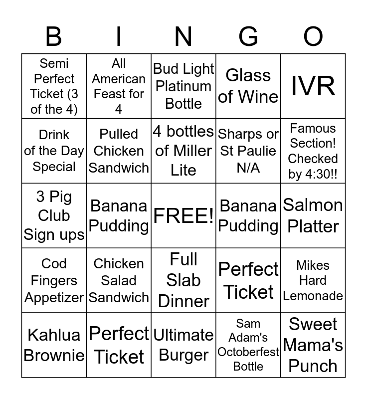 This bingo card has a free space and 24 words: Chicken Salad Sandwich, Perfect Ticket, 4 bottles of Miller Lite, Kahlua Brownie, IVR, Semi Perfect Ticket (3 of the 4), Drink of the Day Special, All American Feast for 4, Banana Pudding, Full Slab Dinner, Sharps or St Paulie N/A, 3 Pig Club Sign ups, Perfect Ticket, Mikes Hard Lemonade, Pulled Chicken Sandwich, Sam Adam's Octoberfest Bottle, Salmon Platter, Bud Light Platinum Bottle, Famous Section! Checked by 4:30!!, Banana Pudding, Sweet Mama's Punch, Cod Fingers Appetizer, Glass of Wine and Ultimate Burger.