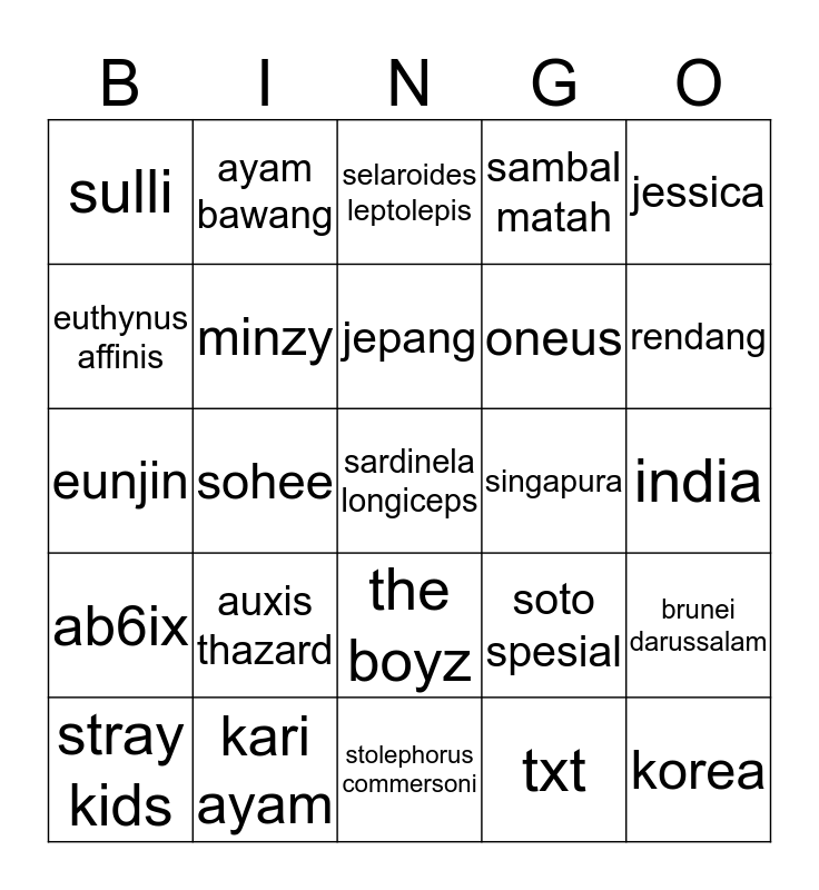 This bingo card has a free space and 24 words: auxis thazard, kari ayam, jepang, stray kids, jessica, sulli, euthynus affinis, ayam bawang, singapura, the boyz, oneus, eunjin, soto spesial, brunei darussalam, minzy, txt, india, selaroides leptolepis, rendang, sohee, korea, ab6ix, sambal matah and stolephorus commersoni.