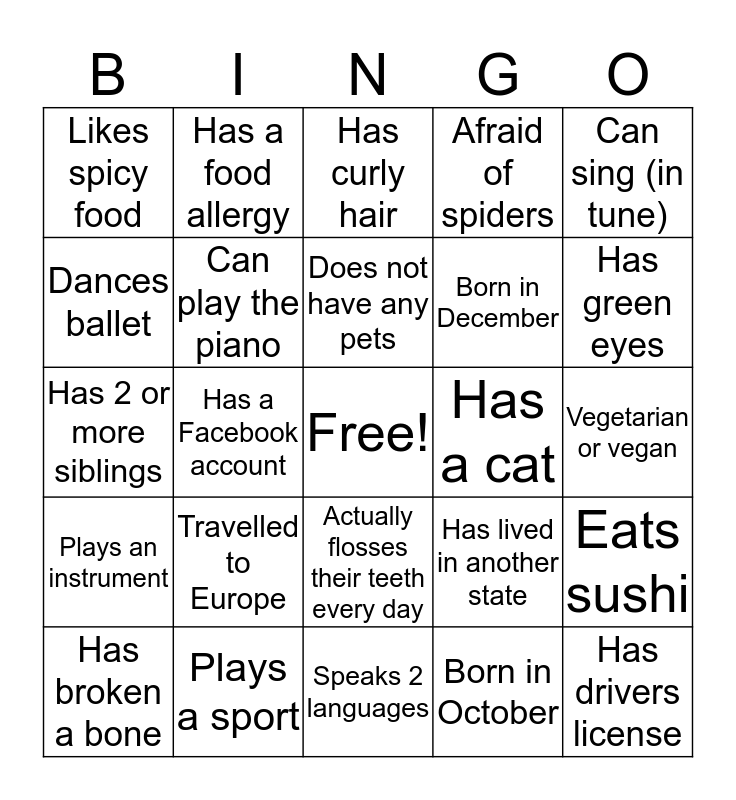 This bingo card has a free space and 29 words: Has broken a bone, Hates math, Has a Facebook account, Wears contacts, Likes spicy food, Has curly hair, Can play the piano, Travelled to Europe, Has a cat, Plays a sport, Vegetarian or vegan, Has drivers license, Speaks 2 languages, Born in October, Has green eyes, Has a first name that starts with A,M, or J, Actually flosses their teeth every day, Plays an instrument, Can sing (in tune), Has 2 or more siblings, Has lived in another state, Left handed, Born in December, Dances ballet, Afraid of spiders, Has a food allergy, Eats sushi, Does not have any pets and Has or had braces.