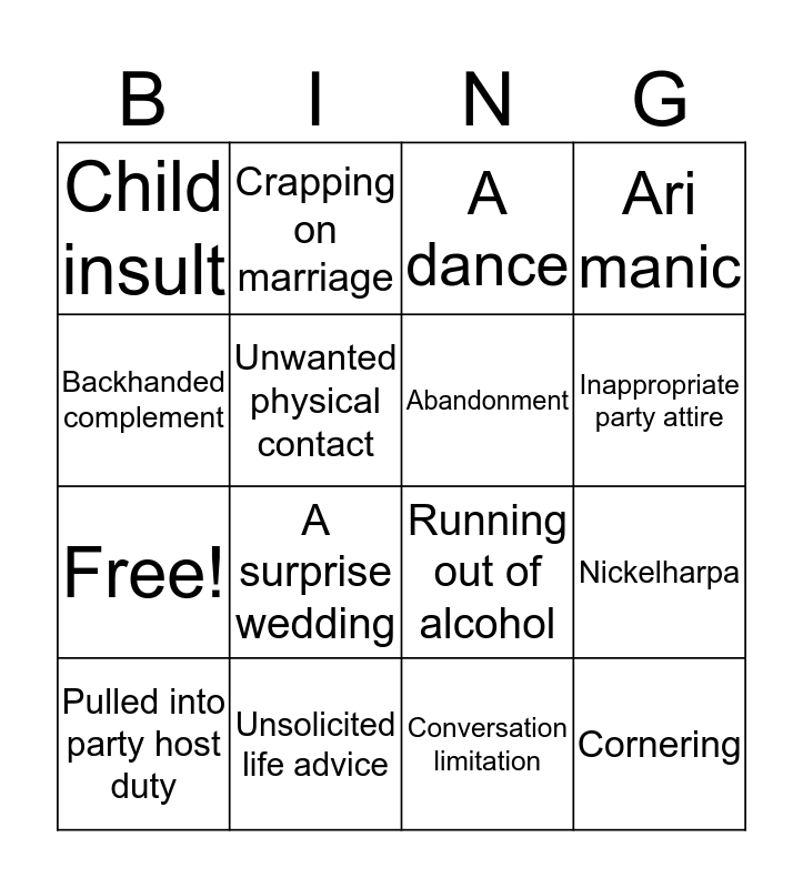 This bingo card has 20 words: Nickelharpa, A song, A dance, Name shittiness, Pulled into party host duty, Backhanded complement, Unsolicited life advice, Child insult, Free!, Crapping on marriage, A surprise wedding, Running out of alcohol, Unwanted physical contact, Cornering, Abandonment, Politics in a speech, Inappropriate party attire, Ari manic, Conversation limitation and Inappropriate toast.