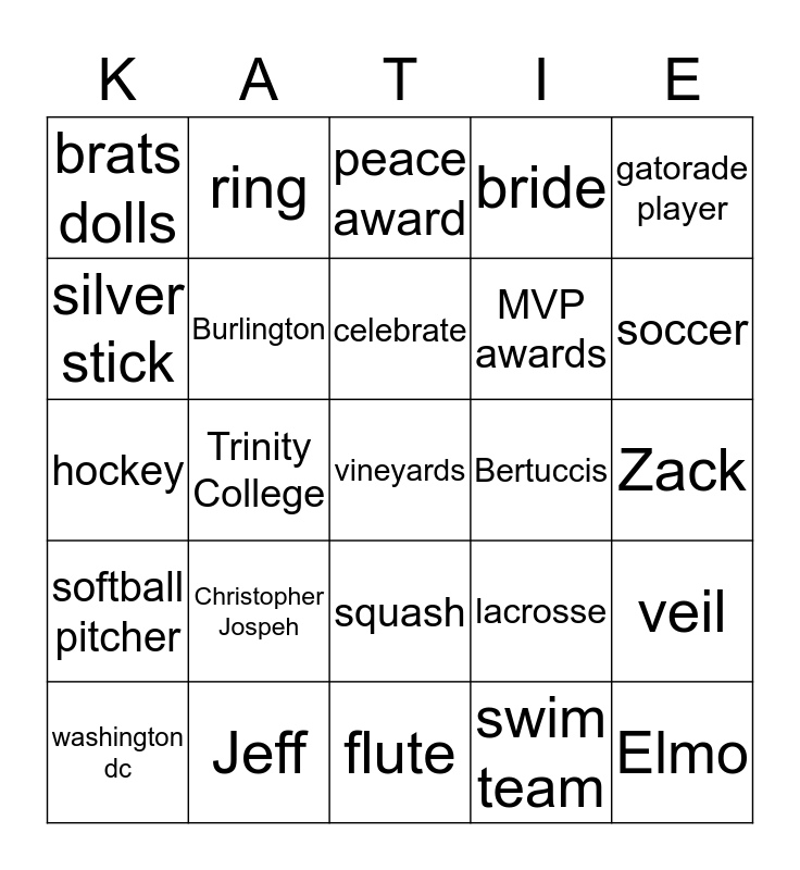 This bingo card has a free space and 29 words: washington dc, katerina elizabeth, Trinity College, Alie, brats dolls, peace award, Burlington, Christopher Jospeh, Bertuccis, Jeff, Zack, Elmo, flute, swim team, soccer, basketball, squash, softball pitcher, gatorade player, hockey, lacrosse, golf, MVP awards, silver stick, bride, ring, veil, celebrate and sparkle.
