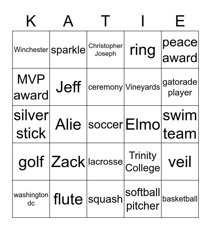 This bingo card has a free space and 29 words: washington dc, Katerina Elizabeth, Alie, Brats dolls, Winchester, Christopher Joseph, Jeff, Zack, Elmo, flute, swim team, basketball, squash, softball pitcher, gatorade player, hockey, lacrosse, golf, peace award, silver stick, Trinity College, Bertuccis, Vineyards, MVP award, ring, sparkle, veil, ceremony and bride.