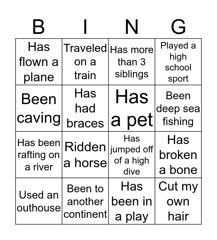 This bingo card has 16 words: Been to another continent, Has broken a bone, Has more than 3 siblings, Has flown a plane, Has been rafting on a river, Traveled on a train, Has jumped off of a high dive, Has been in a play, Been caving, Has had braces, Used an outhouse, Played a high school sport, Ridden a horse, Been deep sea fishing, Has a pet and Cut my own hair.