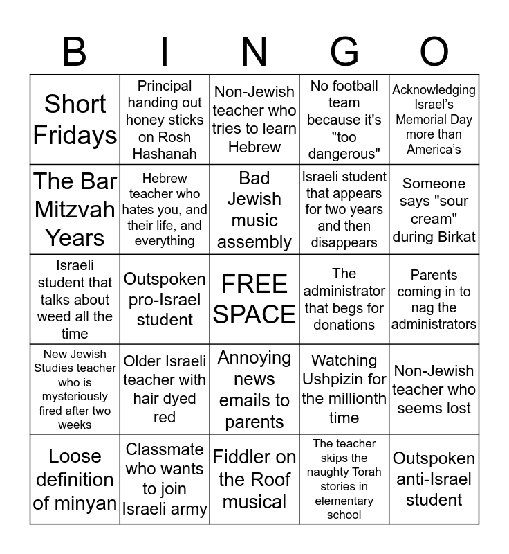 This bingo card has a free space and 24 words: Older Israeli teacher with hair dyed red, Classmate who wants to join Israeli army, Bad Jewish music assembly, Loose definition of minyan, Acknowledging Israel’s Memorial Day more than America’s, Short Fridays, The Bar Mitzvah Years, Principal handing out honey sticks on Rosh Hashanah, The administrator that begs for donations, Annoying news emails to parents, Israeli student that appears for two years and then disappears, Israeli student that talks about weed all the time, Watching Ushpizin for the millionth time, Non-Jewish teacher who seems lost, Hebrew teacher who hates you, and their life, and everything, The teacher skips the naughty Torah stories in elementary school, Parents coming in to nag the administrators, Non-Jewish teacher who tries to learn Hebrew, Someone says "sour cream" during Birkat, Outspoken pro-Israel student, Outspoken anti-Israel student, New Jewish Studies teacher who is mysteriously fired after two weeks, No football team because it's "too dangerous" and Fiddler on the Roof musical.