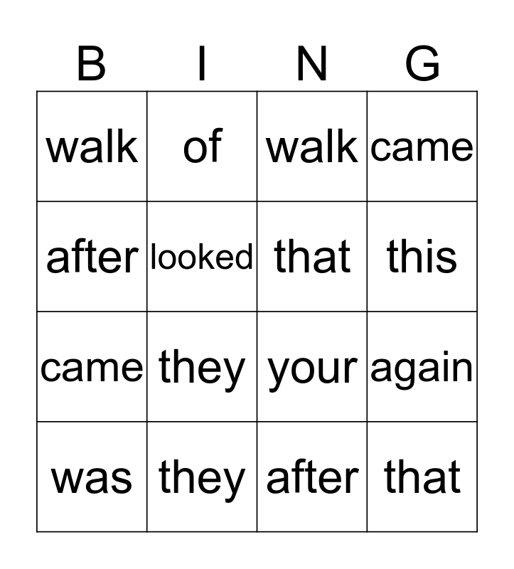 This bingo card has 24 words: happy, two, this, please, after, walk, looked, of, they, again, came, your, shouting, was, that, be, after, walk, they, again, was, that, came and looked.
