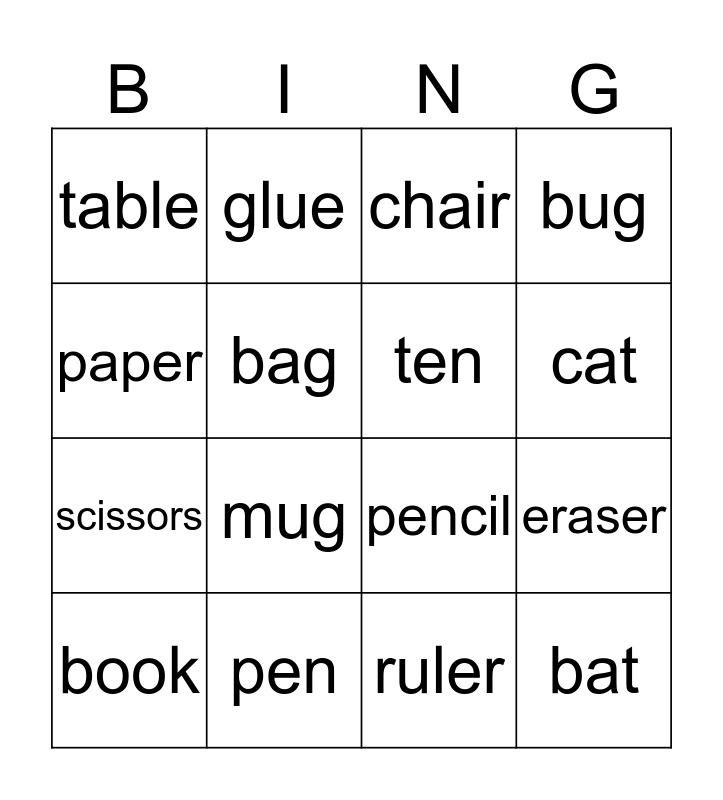 This bingo card has 16 words: pen, eraser, chair, table, scissors, glue, pencil, ruler, paper, bag, book, bug, mug, cat, ten and bat.