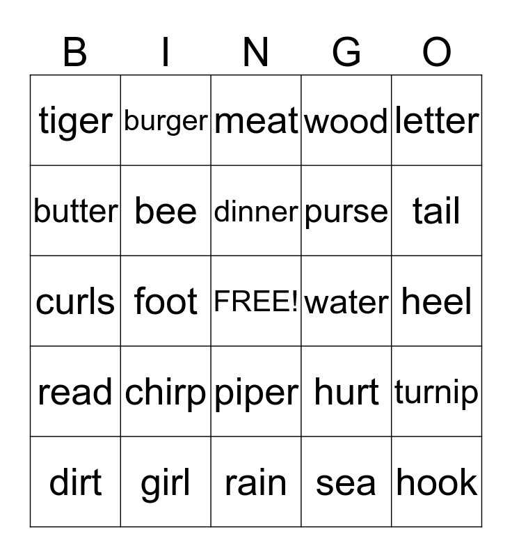 This bingo card has a free space and 24 words: chirp, girl, dinner, dirt, letter, tiger, butter, burger, water, piper, purse, curls, hurt, turnip, bee, sea, heel, meat, tail, foot, hook, read, wood and rain.