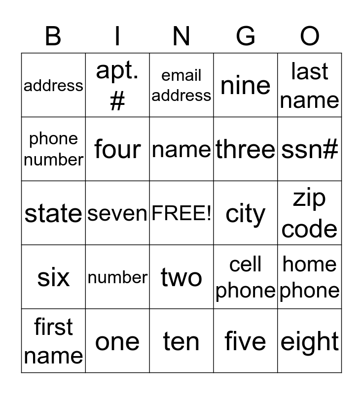 This bingo card has a free space and 24 words: number, one, name, first name, last name, address, phone number, apt. #, city, two, three, state, cell phone, home phone, four, five, zip code, email address, ssn#, seven, eight, six, nine and ten.