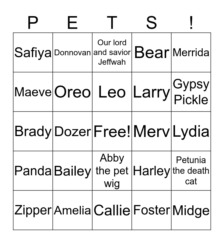 This bingo card has a free space and 24 words: Bailey, Amelia, Leo, Zipper, Merrida, Safiya, Maeve, Donnovan, Merv, Abby the pet wig, Larry, Brady, Harley, Petunia the death cat, Oreo, Foster, Lydia, Our lord and savior Jeffwah, Gypsy Pickle, Dozer, Midge, Panda, Bear and Callie.