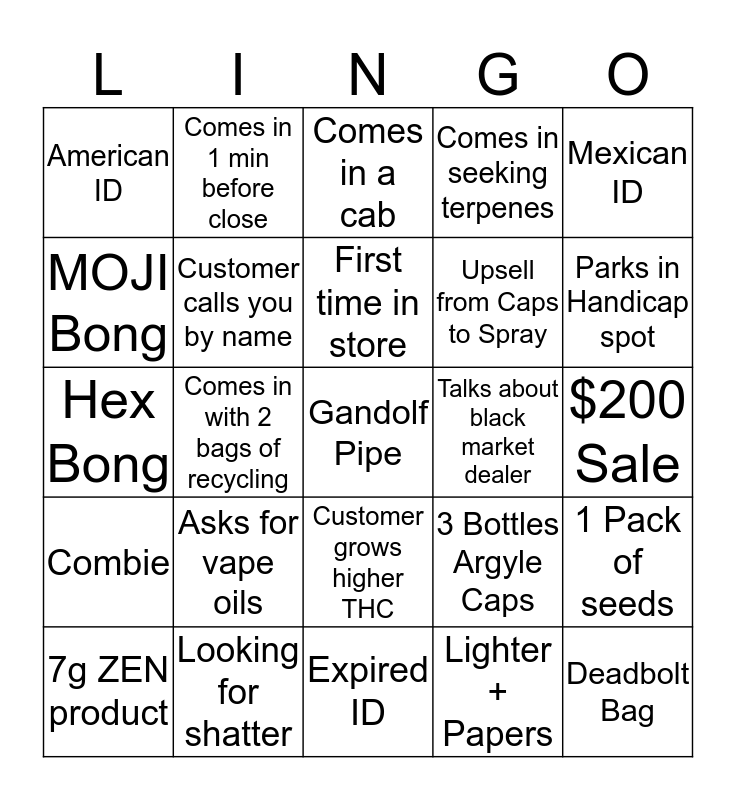 This bingo card has a free space and 24 words: Asks for vape oils, Looking for shatter, First time in store, 7g ZEN product, Mexican ID, American ID, MOJI Bong, Comes in 1 min before close, Talks about black market dealer, Customer grows higher THC, Upsell from Caps to Spray, Hex Bong, 3 Bottles Argyle Caps, 1 Pack of seeds, Customer calls you by name, Lighter + Papers, $200 Sale, Comes in a cab, Parks in Handicap spot, Comes in with 2 bags of recycling, Deadbolt Bag, Combie, Comes in seeking terpenes and Expired ID.