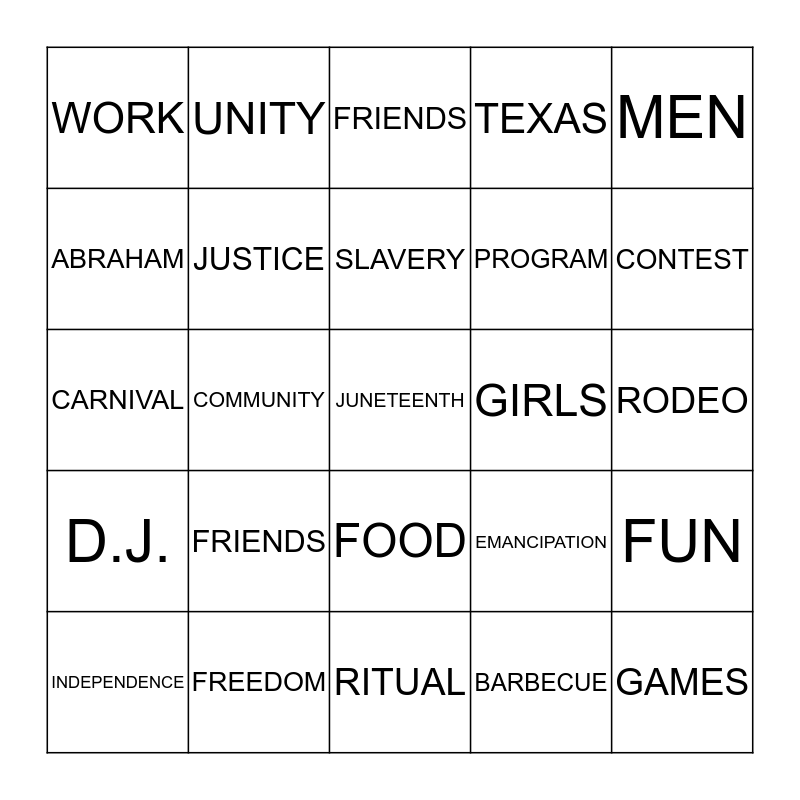 This bingo card has a free space and 24 words: FRIENDS, FREEDOM, SLAVERY, INDEPENDENCE, MEN, WORK, ABRAHAM, UNITY, GIRLS, FOOD, PROGRAM, CARNIVAL, EMANCIPATION, FUN, JUSTICE, BARBECUE, RODEO, FRIENDS, CONTEST, COMMUNITY, GAMES, D.J., TEXAS and RITUAL.
