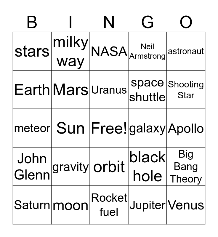 This bingo card has a free space and 24 words: gravity, moon, Uranus, Saturn, astronaut, stars, Earth, milky way, galaxy, orbit, space shuttle, meteor, black hole, Big Bang Theory, Mars, Jupiter, Apollo, NASA, Shooting Star, Sun, Venus, John Glenn, Neil Armstrong and Rocket fuel.