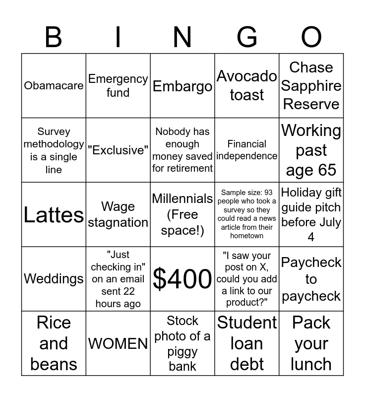 This bingo card has a free space and 24 words: Rice and beans, "Just checking in" on an email sent 22 hours ago, Nobody has enough money saved for retirement, Student loan debt, Chase Sapphire Reserve, Obamacare, Emergency fund, Embargo, Sample size: 93 people who took a survey so they could read a news article from their hometown, Holiday gift guide pitch before July 4, Lattes, "Exclusive", "I saw your post on X, could you add a link to our product?", Paycheck to paycheck, Survey methodology is a single line, WOMEN, Stock photo of a piggy bank, Avocado toast, Working past age 65, Weddings, Wage stagnation, $400, Financial independence and Pack your lunch.