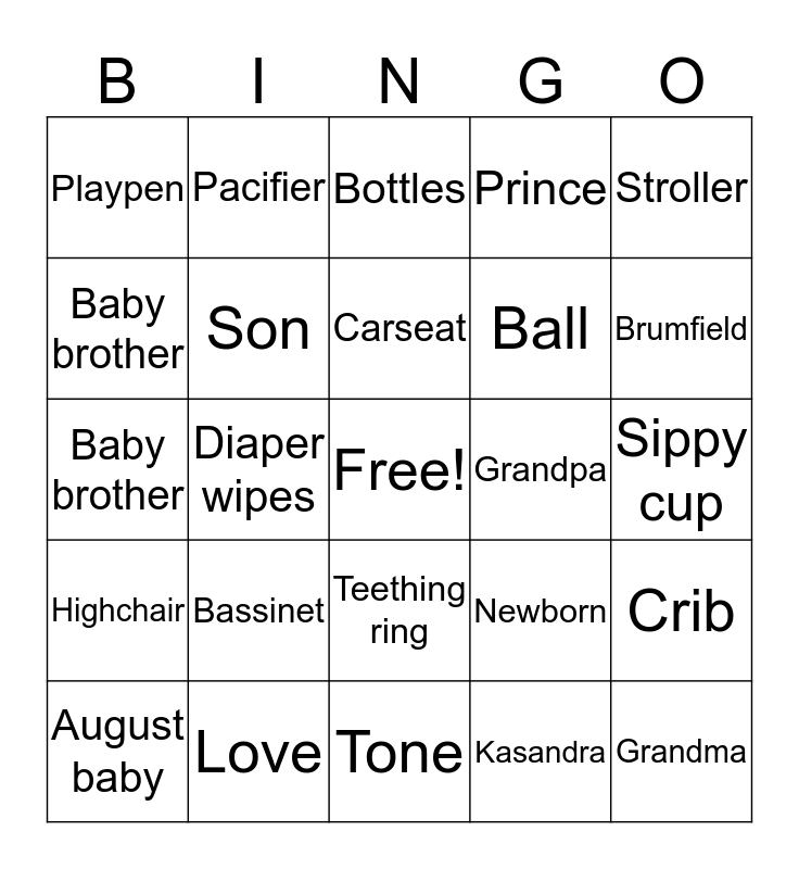 This bingo card has a free space and 29 words: August baby, Sports, Diaper wipes, Nephew, Playpen, Bottles, Son, Bassinet, Grandpa, Love, Sippy cup, Grandma, Tone, Kasandra, Brumfield, Family, Teething ring, Highchair, Stroller, Baby brother, Newborn, Bouncy chair, Ball, Baby brother, Prince, Pacifier, Crib, Carseat and Baby food.