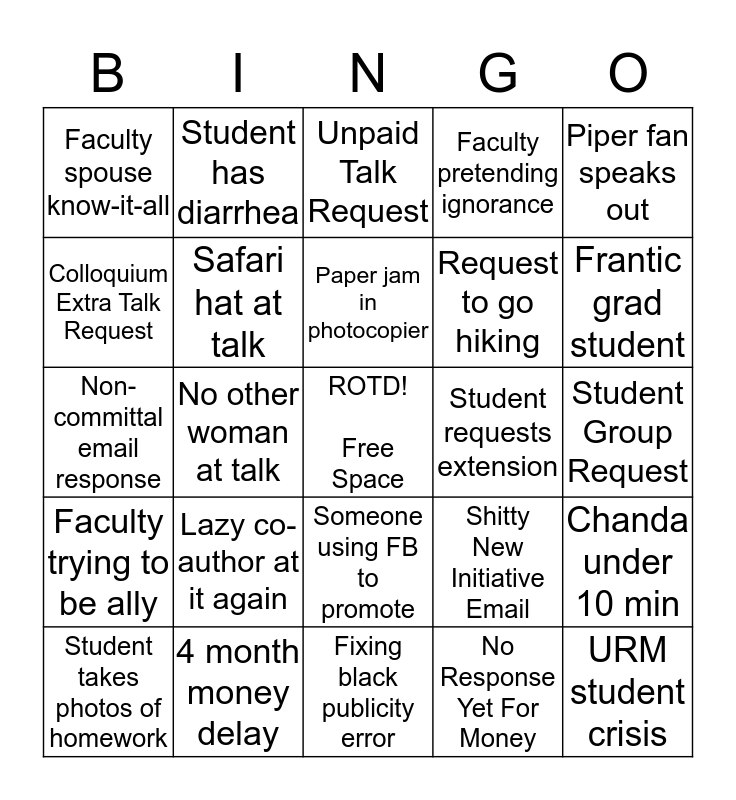 This bingo card has a free space and 24 words: Lazy co-author at it again, 4 month money delay, Paper jam in photocopier, Student takes photos of homework, Piper fan speaks out, Faculty spouse know-it-all, Colloquium Extra Talk Request, Student has diarrhea, Student requests extension, Someone using FB to promote, Request to go hiking, Non-committal email response, Shitty New Initiative Email, Chanda under 10 min, Safari hat at talk, No Response Yet For Money, Student Group Request, Unpaid Talk Request, Frantic grad student, No other woman at talk, URM student crisis, Faculty trying to be ally, Faculty pretending ignorance and Fixing black publicity error.