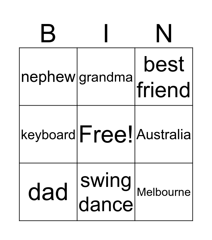 This bingo card has a free space and 24 words: house, sister, friends, possum, Melbourne, nephew, grandma, best friend, emu, teacher, mom, cousins, koala, English, dad, aunty, kangaroo, keyboard, swing dance, grandpa, uncle, wombat, Australia and Japan.