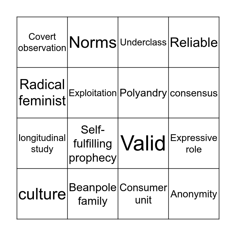 This bingo card has 16 words: Beanpole family, Expressive role, Underclass, Covert observation, longitudinal study, Norms, Valid, Consumer unit, Radical feminist, Exploitation, culture, Reliable, Self-fulfilling prophecy, consensus, Polyandry and Anonymity.