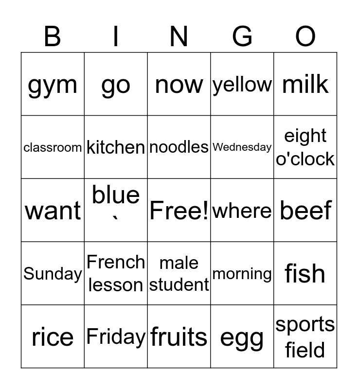 This bingo card has a free space and 24 words: French lesson, Friday, noodles, rice, milk, gym, classroom, go, where, male student, Wednesday, want, morning, fish, kitchen, egg, beef, now, eight o'clock, blue `, sports field, Sunday, yellow and fruits.