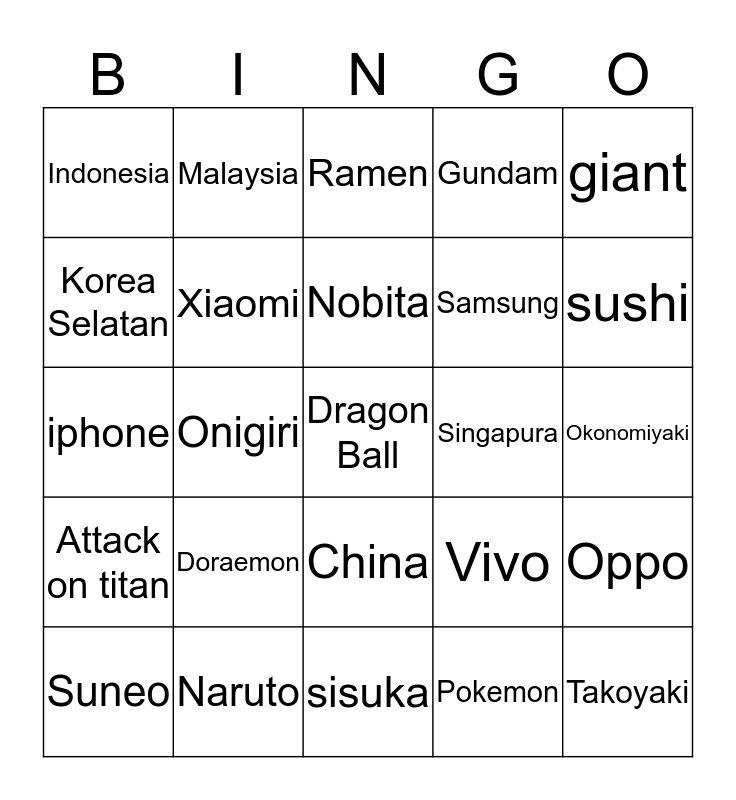 This bingo card has 25 words: Doraemon, sisuka, Nobita, Suneo, giant, Indonesia, Korea Selatan, Malaysia, Singapura, China, Samsung, iphone, Vivo, Oppo, Xiaomi, Takoyaki, Okonomiyaki, Ramen, sushi, Onigiri, Dragon Ball, Naruto, Attack on titan, Gundam and Pokemon.