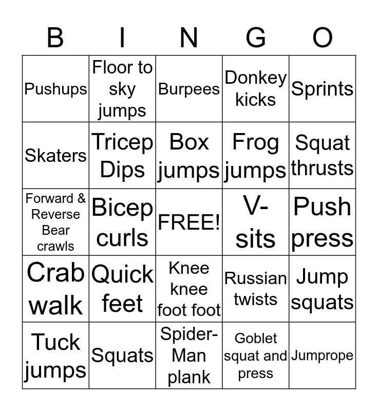 This bingo card has a free space and 29 words: Jumping jacks, Squats, Burpees, Plank, Sprints, Pushups, Tricep Dips, Box jumps, V-sits, Jump squats, Tuck jumps, Bicep curls, Goblet squat and press, Jumprope, Forward & Reverse Bear crawls, Inch worms, Spider-Man plank, Russian twists, Squat thrusts, Crab walk, Quick feet, Jump lunges, Frog jumps, Push press, Skaters, Floor to sky jumps, Knee knee foot foot, Donkey kicks and Bunny hops.
