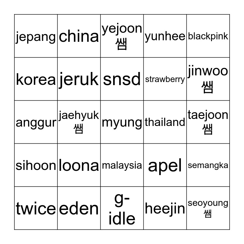 This bingo card has 25 words: loona, g-idle, snsd, twice, blackpink, jepang, korea, china, thailand, malaysia, strawberry, anggur, apel, semangka, jeruk, seoyoung 쌤, taejoon 쌤, yejoon 쌤, jinwoo 쌤, jaehyuk 쌤, myung, eden, sihoon, yunhee and heejin.