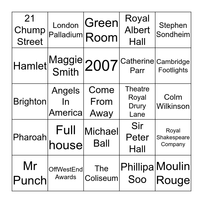 This bingo card has 50 words: The Taming of the Shrew, Come From Away, Only Fools and Horses, The Coliseum, Full house, Sweet Charity, London Palladium, Chicago, Hamlet, Sting, Maggie Smith, Royal Albert Hall, Royal Shakespeare Company, Sir Peter Hall, The Curious Incident of the Dog in the Nighttime, All About Eve, 2007, Theatre Royal Drury Lane, Wicked, Stephen Sondheim, Angels In America, Phillipa Soo, 21 Chump Street, Catherine Parr, Fly a kite, Moulin Rouge, Cambridge Footlights, Stratford-Upon-Avon, Green Room, Michael Ball, Juliet, Edinburgh Festival Fringe, Birmingham, Regents Park, OffWestEnd Awards, Pies, Harry Potter and the Cursed Child, Small Island, The Mousetrap, Colm Wilkinson, The Adelphi Theatre, Tom Holland, Harold Pinter, 9 To 5, Mr Punch, Brighton, Phoebe Waller-Bridge, Oti Mabuse, Pharoah and Elsa.