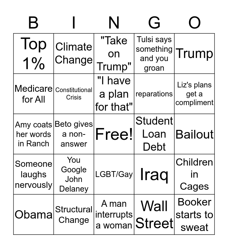 This bingo card has a free space and 24 words: You Google John Delaney, Structural Change, "I have a plan for that", Obama, Trump, Top 1%, Medicare for All, Climate Change, Student Loan Debt, LGBT/Gay, reparations, Amy coats her words in Ranch, Iraq, Children in Cages, Constitutional Crisis, Wall Street, Bailout, "Take on Trump", Liz's plans get a compliment, Beto gives a non-answer, Booker starts to sweat, Someone laughs nervously, Tulsi says something and you groan and A man interrupts a woman.