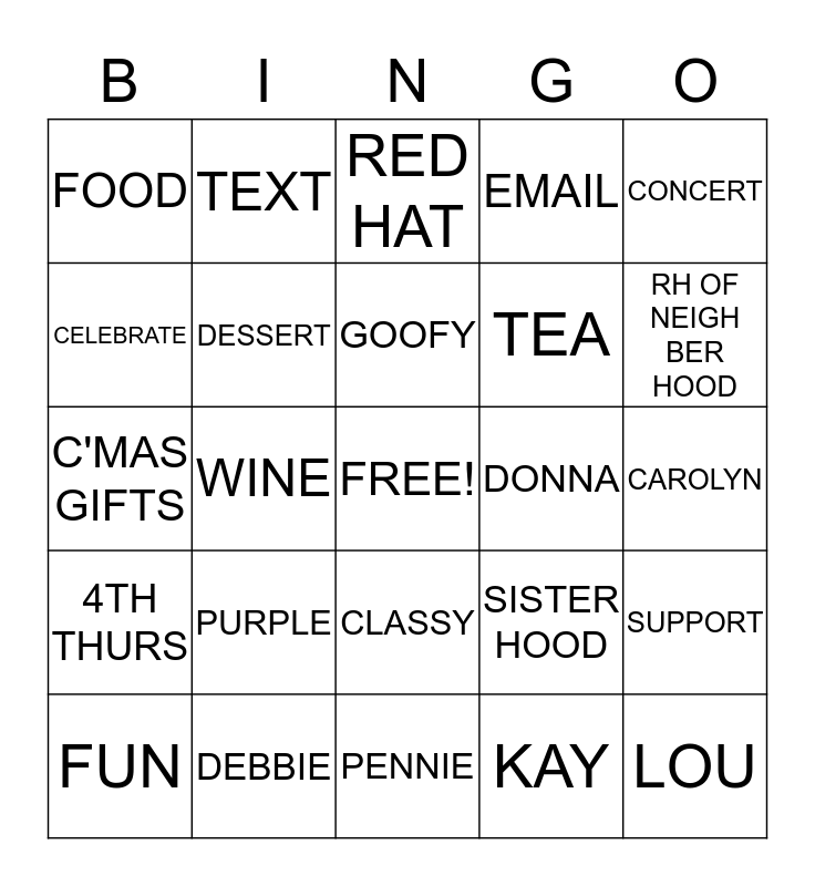 This bingo card has a free space and 29 words: FUN, FRIENDS, WINE, LAUGH, FOOD, RED HAT, DESSERT, PURPLE, DONNA, DEBBIE, CAROLYN, LOU, PENNIE, KAY, RH OF NEIGH BER HOOD, BIRTH DAY, CLASSY, 4TH THURS, CONCERT, C'MAS GIFTS, SISTER HOOD, GAMES, TEA, CELEBRATE, EMAIL, TEXT, SUPPORT, GOOFY and MATURE.