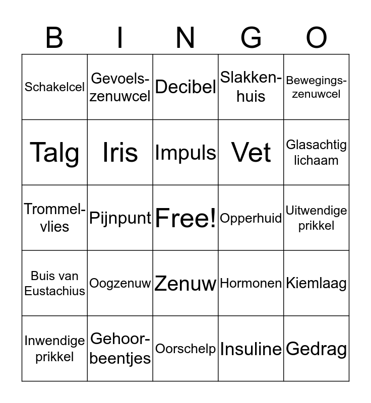 This bingo card has a free space and 45 words: Hersenen, Gedrag, Lederhuid, Inwendige prikkel, Onderhuids bindweefsel, Insuline, Decibel, Centraal zenuwstelsel, Bewegings-zenuwcel, Gehoor-beentjes, Slakken-huis, Opperhuid, Zenuw, Oogzenuw, Hoornlaag, Oorschelp, Ruggemerg, Trommel-vlies, Respons, Glasachtig lichaam, Gevoels-zenuwcel, Harde oogvlies, Diabetes, Schakelcel, Smaak-knopjes, Uitwendige prikkel, Vaatvlies, Lens, Hormonen, Buis van Eustachius, Reukharen, Kiemlaag, Hormoon-klier, Gedrags-keten, Netvlies, Pijnpunt, Prikkel, Tastzintuig, Drukzintuig, Impuls, Talg, Vet, Oorsmeer, Iris and Traanbuizen.