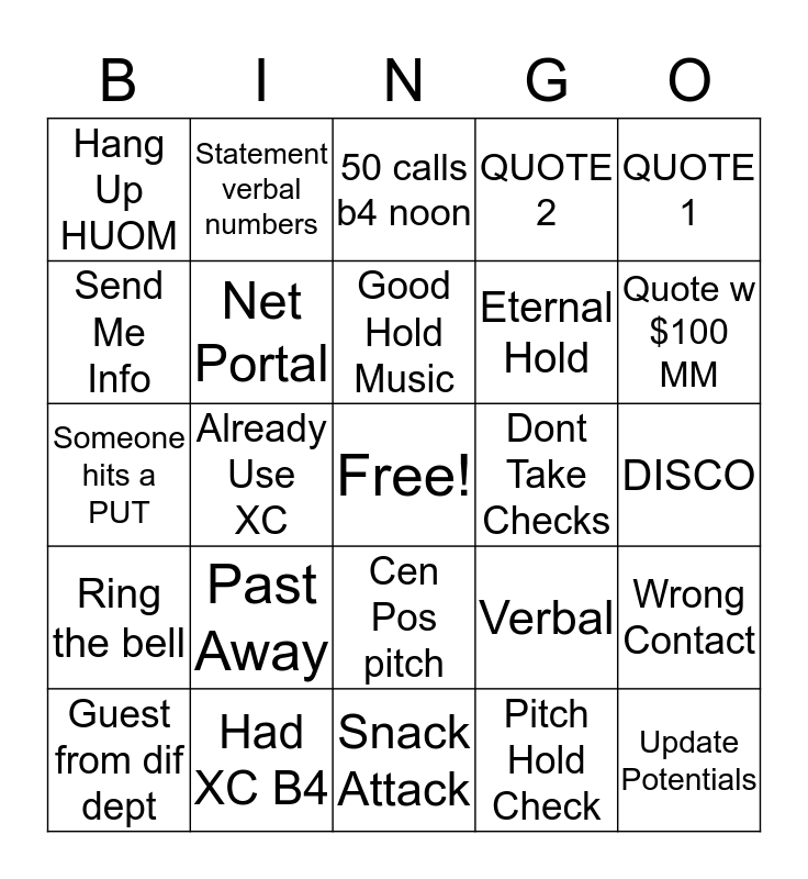 This bingo card has a free space and 24 words: Past Away, Had XC B4, Good Hold Music, Guest from dif dept, QUOTE 1, Hang Up HUOM, Send Me Info, Statement verbal numbers, Dont Take Checks, Cen Pos pitch, Eternal Hold, Someone hits a PUT, Verbal, Wrong Contact, Net Portal, Pitch Hold Check, DISCO, 50 calls b4 noon, Quote w $100 MM, Already Use XC, Update Potentials, Ring the bell, QUOTE 2 and Snack Attack.