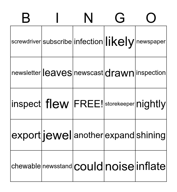 This bingo card has a free space and 24 words: jewel, newsstand, newscast, chewable, newspaper, screwdriver, newsletter, subscribe, storekeeper, another, drawn, inspect, expand, shining, leaves, noise, nightly, infection, inspection, flew, inflate, export, likely and could.