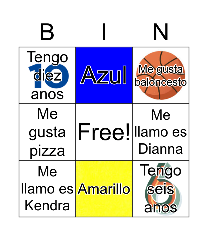 This bingo card has 5 images, a free space and 8 words: Me llamo es Dianna, Me gusta baloncesto, Azul, Me llamo es Kendra, Tengo diez anos, Tengo seis anos, Me gusta pizza and Amarillo.