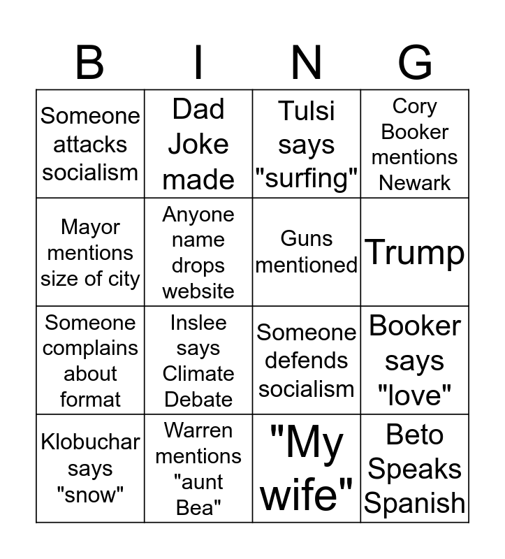 This bingo card has 18 words: Inslee says Climate Debate, Beto Speaks Spanish, Tulsi says "surfing", Someone attacks socialism, Someone defends socialism, Cory Booker mentions Newark, Klobuchar says "snow", Dad Joke made, Trump, Someone complains about format, "My wife", Mayor mentions size of city, Booker says "love", Anyone name drops website, Guns mentioned, "I have a plan for that", Warren mentions "aunt Bea" and John Delany Speaks.
