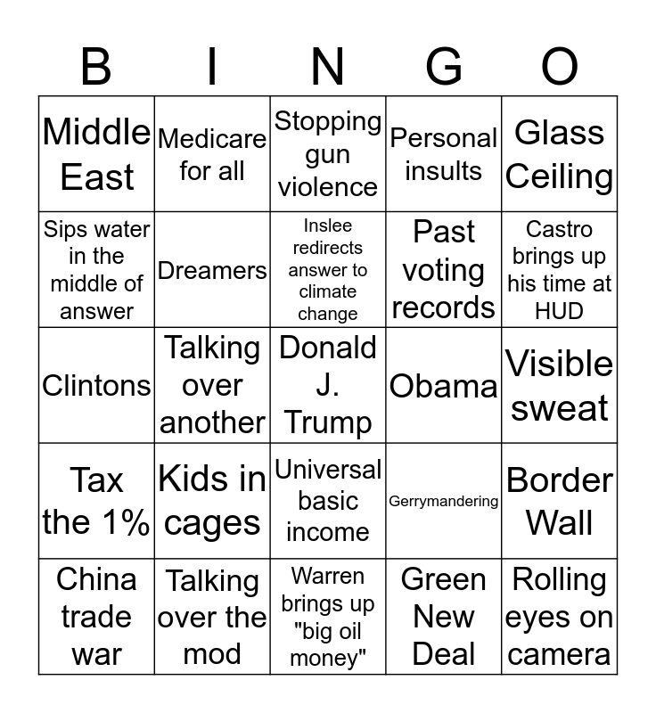 This bingo card has a free space and 32 words: Green New Deal, Student Debt, Talking over another, Iran, Tax the 1%, Dreamers, Glass Ceiling, Border Wall, Medicare for all, Humanitarian crisis, Inslee redirects answer to climate change, Stopping gun violence, Fracking, AOC, Obama, Russian collusion, China trade war, Clintons, Universal basic income, Kids in cages, Gerrymandering, Comment on woman's appearance, Visible sweat, Talking over the mod, Rolling eyes on camera, Personal insults, Past voting records, Sips water in the middle of answer, Middle East, Warren brings up "big oil money", Booker's clemency plan and Castro brings up his time at HUD.