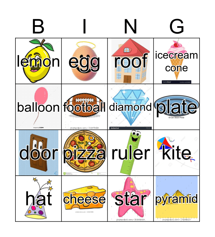 This bingo card has 26 images and 26 words: moon, ball, plate, face, balloon, lemon, football, egg, star, book, door, ruler, envelope, christmas star, kite, starfruit, icecream cone, pyramid, roof, hat, pizza, waffle, cheese, window, diamond and dice.