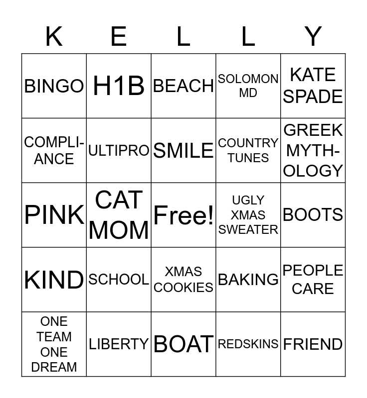 This bingo card has a free space and 35 words: LEIA, #ALLCAPS, ROSE, ULTIPRO, XMAS COOKIES, SOLOMON MD, COMPLI- ANCE, IMMIGRA-TION, SMILE, 13 YEARS, PINK, KATE SPADE, IRELAND, TAYLOR SWIFT, BINGO, UGLY XMAS SWEATER, REDSKINS, CAT MOM, KIND, FRIEND, BAKING, ONE TEAM ONE DREAM, PEOPLE CARE, LIBERTY, BEACH, GREEK MYTH- OLOGY, JULY 3RD, ELE- PHANTS, COUNTRY TUNES, BOOTS, AUGUST 14, 2006, BOAT, SCHOOL, H1B and BENEFITS.