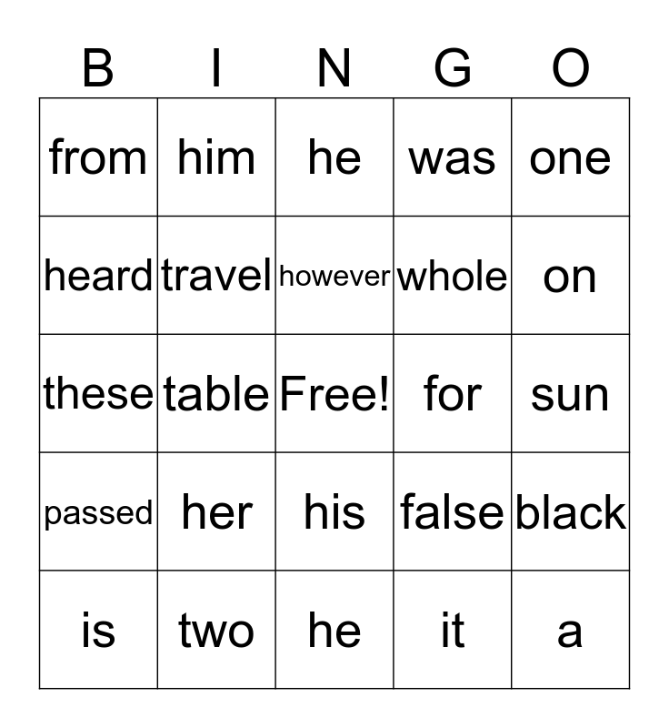 This bingo card has a free space and 44 words: the, a, to, is, you, it, he, and, one, two, was, for, his, her, she, he, look, these, there, on, him, like, who, from, waves, sun, reach, true, false, passed, cold, black, against, pattern, table, unit, ground, usually, however, heard, whole, numeral, travel and certain.