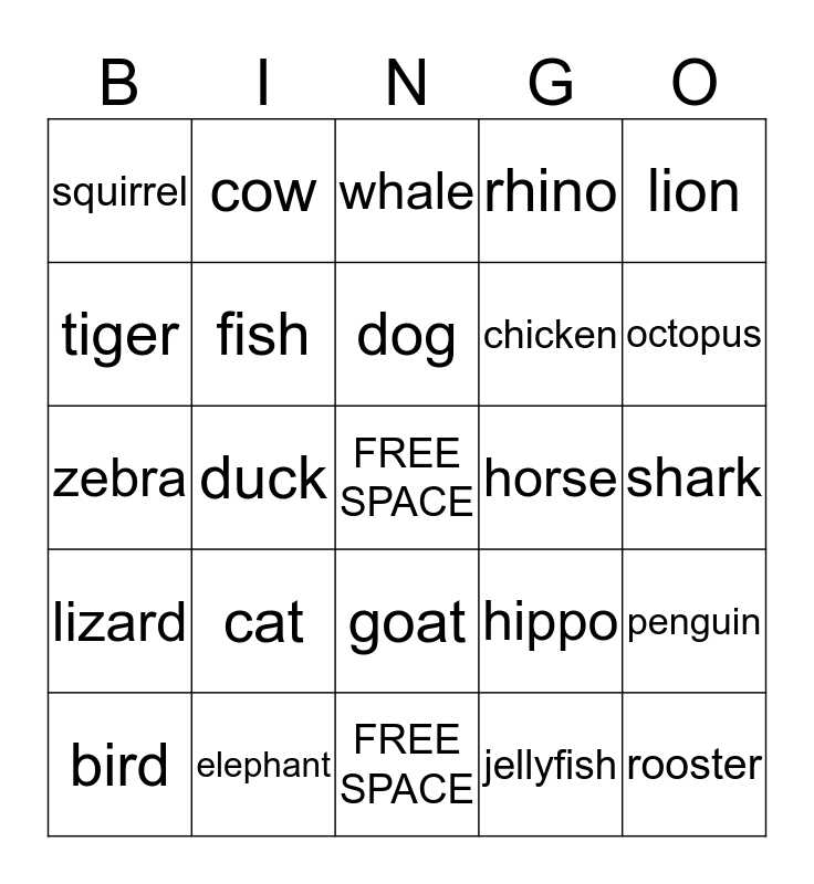 This bingo card has a free space and 24 words: cat, elephant, dog, bird, lion, squirrel, tiger, cow, horse, goat, chicken, zebra, hippo, penguin, fish, jellyfish, shark, whale, octopus, duck, rooster, lizard, rhino and FREE SPACE.