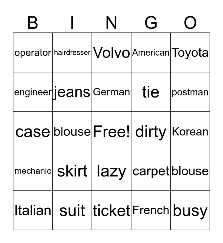 This bingo card has a free space and 24 words: skirt, suit, German, Italian, Toyota, operator, engineer, hairdresser, dirty, lazy, tie, case, carpet, blouse, jeans, French, Korean, Volvo, postman, blouse, busy, mechanic, American and ticket.