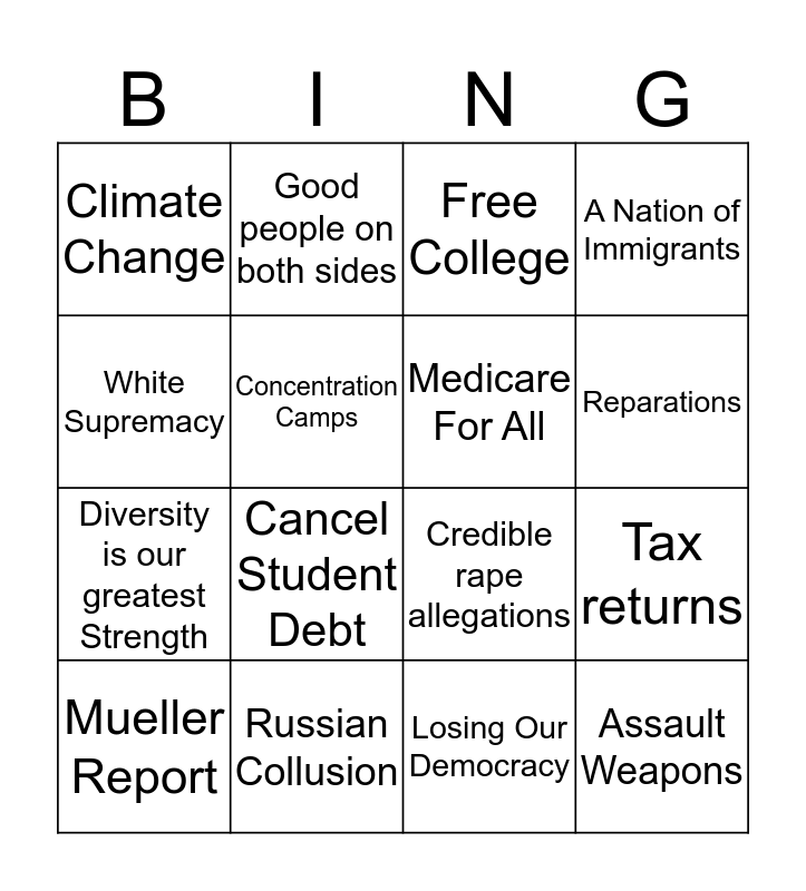 This bingo card has 16 words: Russian Collusion, Tax returns, Free College, Climate Change, Diversity is our greatest Strength, Good people on both sides, Credible rape allegations, Losing Our Democracy, White Supremacy, Concentration Camps, Mueller Report, A Nation of Immigrants, Cancel Student Debt, Reparations, Medicare For All and Assault Weapons.