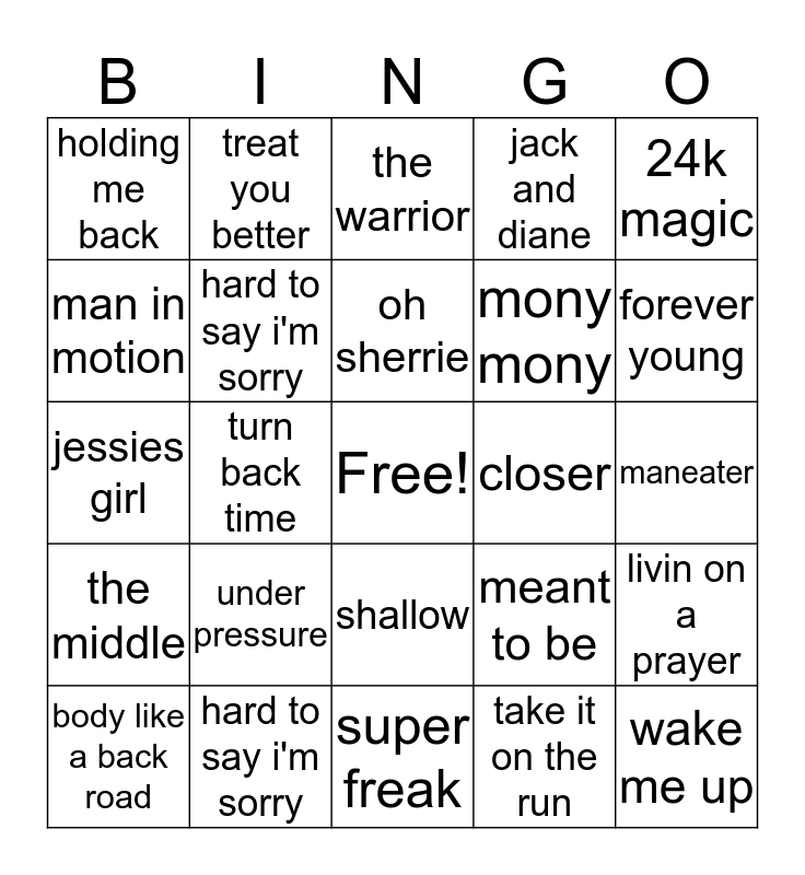 This bingo card has a free space and 24 words: under pressure, hard to say i'm sorry, oh sherrie, body like a back road, 24k magic, holding me back, man in motion, treat you better, closer, shallow, mony mony, jessies girl, meant to be, livin on a prayer, hard to say i'm sorry, take it on the run, maneater, the warrior, forever young, turn back time, wake me up, the middle, jack and diane and super freak.