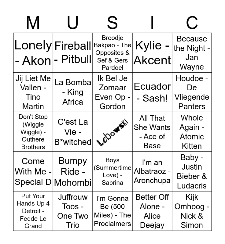 This bingo card has a free space and 24 words: Bumpy Ride - Mohombi, Juffrouw Toos - One Two Trio, Ik Bel Je Zomaar Even Op - Gordon, Put Your Hands Up 4 Detroit - Fedde Le Grand, Because the Night - Jan Wayne, Lonely - Akon, Jij Liet Me Vallen - Tino Martin, Fireball - Pitbull, All That She Wants - Ace of Base, Boys (Summertime Love) - Sabrina, Ecuador - Sash!, Don't Stop (Wiggle Wiggle) - Outhere Brothers, I'm an Albatraoz - Aronchupa, Baby - Justin Bieber & Ludacris, La Bomba - King Africa, Better Off Alone - Alice Deejay, Whole Again - Atomic Kitten, Broodje Bakpao - The Opposites & Sef & Gers Pardoel, Houdoe - De Vliegende Panters, C'est La Vie - B*witched, Kijk Omhoog - Nick & Simon, Come With Me - Special D, Kylie - Akcent and I'm Gonna Be (500 Miles) - The Proclaimers.