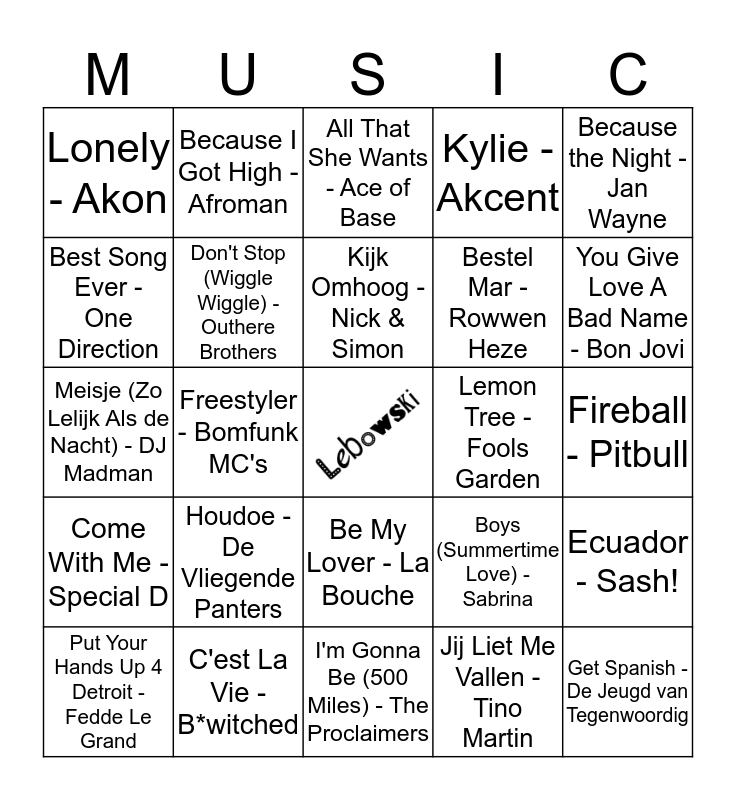 This bingo card has a free space and 24 words: Houdoe - De Vliegende Panters, C'est La Vie - B*witched, Kijk Omhoog - Nick & Simon, Put Your Hands Up 4 Detroit - Fedde Le Grand, Because the Night - Jan Wayne, Lonely - Akon, Best Song Ever - One Direction, Because I Got High - Afroman, Lemon Tree - Fools Garden, Be My Lover - La Bouche, Bestel Mar - Rowwen Heze, Meisje (Zo Lelijk Als de Nacht) - DJ Madman, Boys (Summertime Love) - Sabrina, Ecuador - Sash!, Don't Stop (Wiggle Wiggle) - Outhere Brothers, Jij Liet Me Vallen - Tino Martin, Fireball - Pitbull, All That She Wants - Ace of Base, You Give Love A Bad Name - Bon Jovi, Freestyler - Bomfunk MC's, Get Spanish - De Jeugd van Tegenwoordig, Come With Me - Special D, Kylie - Akcent and I'm Gonna Be (500 Miles) - The Proclaimers.