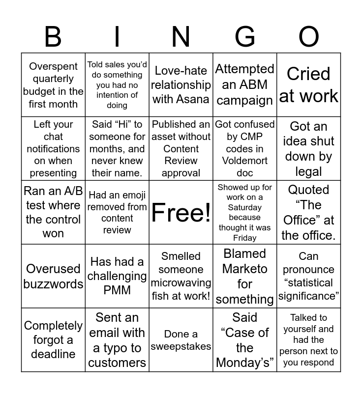This bingo card has a free space and 24 words: Has had a challenging PMM, Sent an email with a typo to customers, Published an asset without Content Review approval, Completely forgot a deadline, Cried at work, Overspent quarterly budget in the first month, Left your chat notifications on when presenting, Told sales you’d do something you had no intention of doing, Showed up for work on a Saturday because thought it was Friday, Smelled someone microwaving fish at work!, Got confused by CMP codes in Voldemort doc, Ran an A/B test where the control won, Blamed Marketo for something, Can pronounce “statistical significance”, Said “Hi” to someone for months, and never knew their name., Said “Case of the Monday’s”, Quoted “The Office” at the office., Love-hate relationship with Asana, Got an idea shut down by legal, Had an emoji removed from content review, Talked to yourself and had the person next to you respond, Overused buzzwords, Attempted an ABM campaign and Done a sweepstakes.