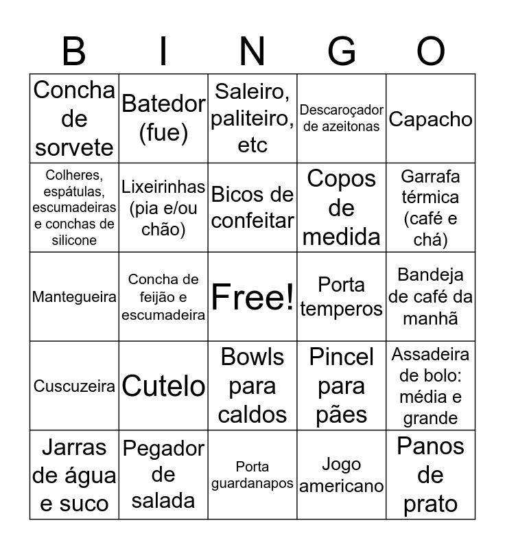This bingo card has a free space and 63 words: Açucareiros, Avental, Abridor de garrafa e abridor latas, Assadeira de bolo: média e grande, Assadeira de pizza grande, Afiador de faca, Batedor (fue), Batedor de carne, Bicos de confeitar, Bule de café, Bowls para caldos, Bacias plásticas: média e grande, Bandeja de café da manhã, Capacho, Colheres de pau, Colheres, espátulas, escumadeiras e conchas de silicone, Concha de feijão e escumadeira, Concha de sorvete, Coador de café, Copos de medida, Cutelo, Cuscuzeira, Descaroçador de azeitonas, Desentupidor de pia, Descanso de panela, Escorredor de louças, Escova para pia, Escorredor de macarrão / arroz, Extrator de escama, Extrator de polpa, Formas de gelo, Formas de tortas e pudins, Frigideiras, Galheteiros: vinagre, óleo, Garrafa térmica (café e chá), Jarras de água e suco, Jogo de xícaras, Jogo americano, Luva térmica, Lixeirinhas (pia e/ou chão), Mantegueira, Porta temperos, Panelas (de todos os tipos), Peneiras: pequena e grande, Panos de prato, Pegador de salada, Pegador de massas, Pincel para pães, Potes plásticos: pequenos, médios e grandes, Puxa saco, Potes para micro-ondas, Porta guardanapos, Rolo de abrir massa, Ralador, Relógio de Cozinha, Saleiro, paliteiro, etc, Suporte de detergente e esponja, Suporte de filtro de café, Saladeira, Taças de vinho, Torradeira e sanduicheira, Tábua de carne and Tesoura de cozinha.