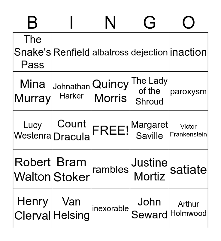 This bingo card has a free space and 24 words: Bram Stoker, Van Helsing, Quincy Morris, Henry Clerval, inaction, The Snake's Pass, Mina Murray, Renfield, Margaret Saville, rambles, The Lady of the Shroud, Lucy Westenra, Justine Mortiz, satiate, Johnathan Harker, John Seward, Victor Frankenstein, albatross, paroxysm, Count Dracula, Arthur Holmwood, Robert Walton, dejection and inexorable.