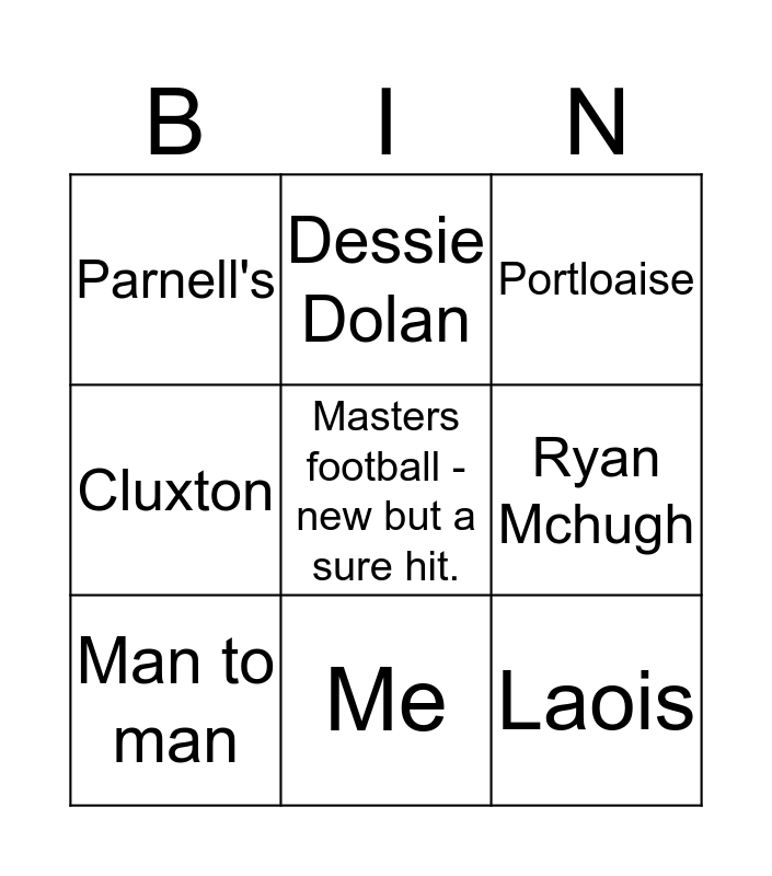 This bingo card has 12 words: Micko, Laois, Masters football - new but a sure hit., Ryan Mchugh, Dessie Dolan, Portloaise, Me, Cheddar, Parnell's, Cluxton, Man to man and Paddy Power.