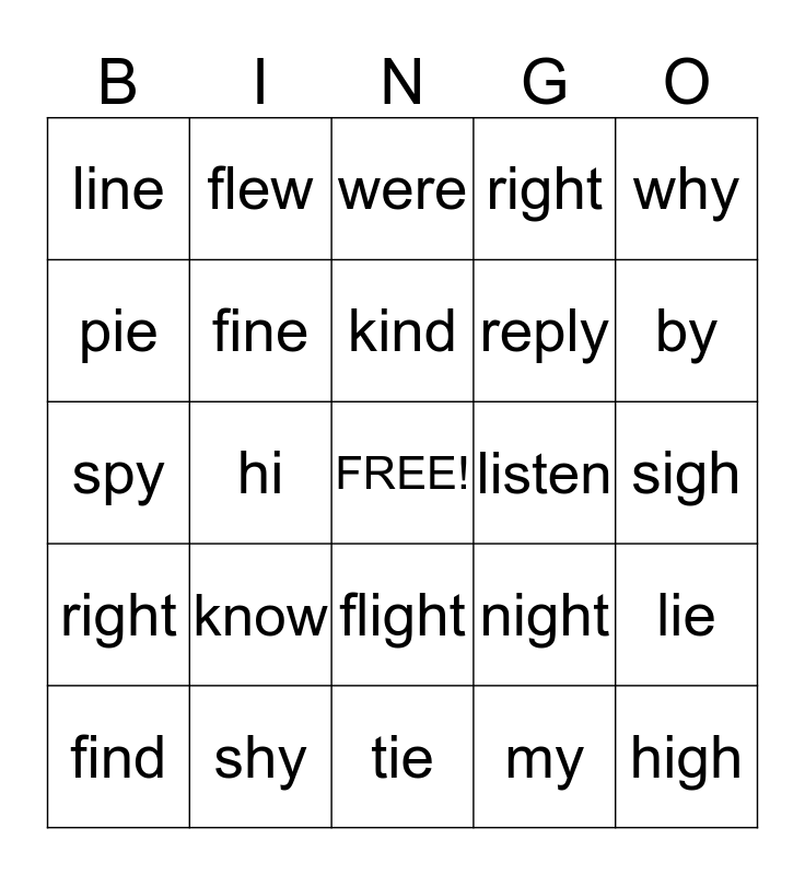 This bingo card has a free space and 24 words: know, shy, kind, find, why, line, pie, flew, listen, flight, reply, spy, night, lie, fine, my, sigh, were, by, hi, high, right, right and tie.